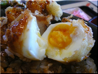 濃厚な甘辛タレが絡む大きな具の天ぷらには、ゆで卵も共演