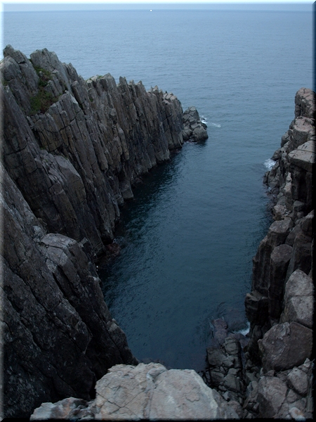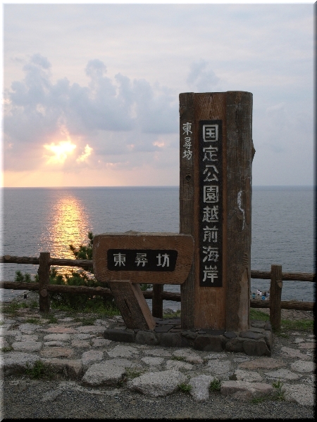 ・ 岩場の谷間に立って日本海に沈む夕日を眺める