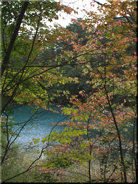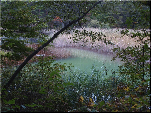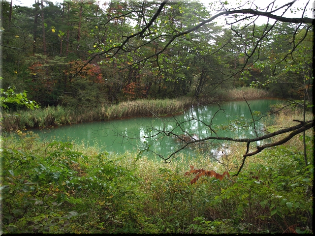 ・ 青沼と枝葉の幻想的な色合いにしばし目を奪われる