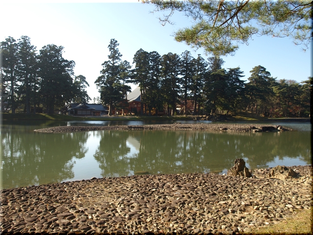 ・ 大泉が池に配された池中立石越しに開山堂を見つめる