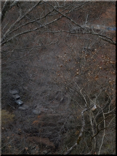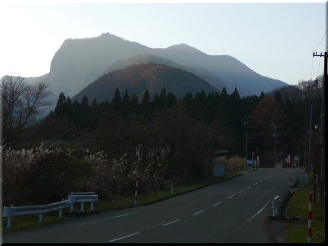 ・ 車へと戻る林道から磐司と呼ばれる大岩壁を眺める