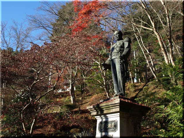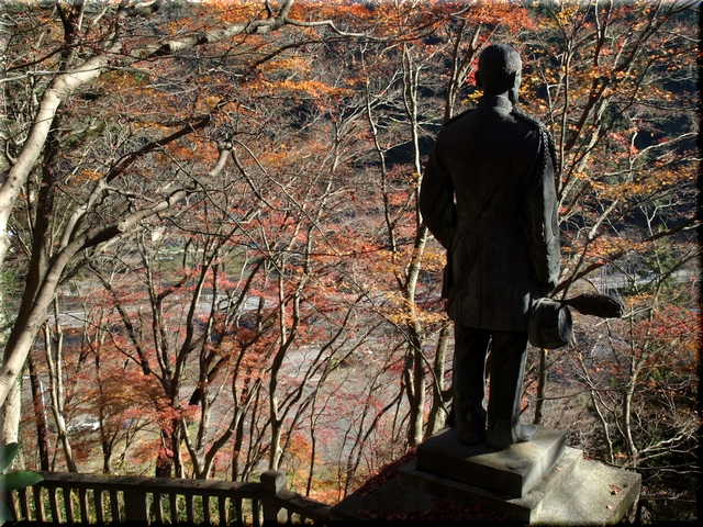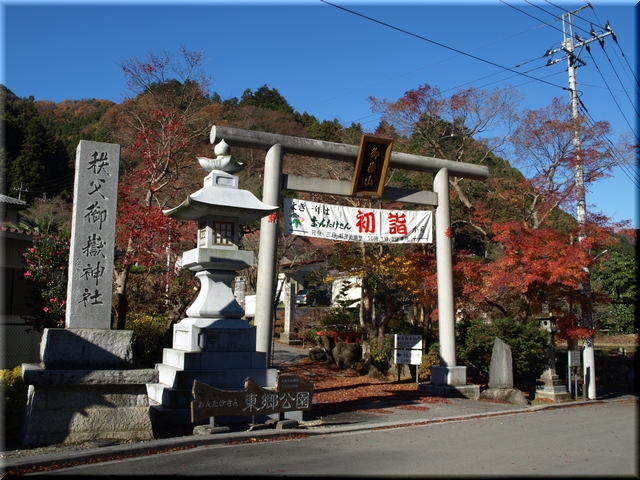 ・ 東郷神社の参拝前に鳥居前で鮮やかな紅葉を楽しむ