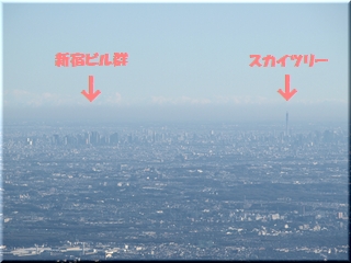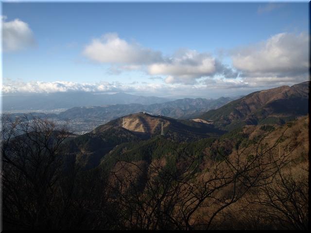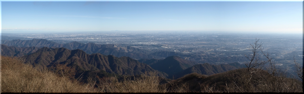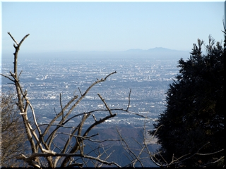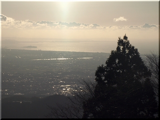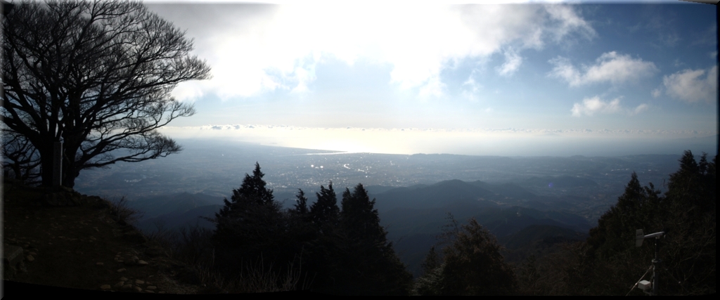・ 山頂から相模川と相模湾に浮かぶ江の島を眺める