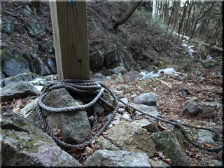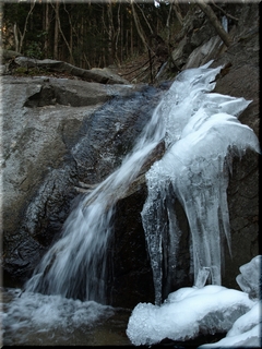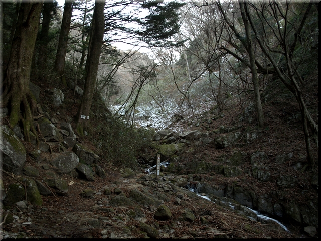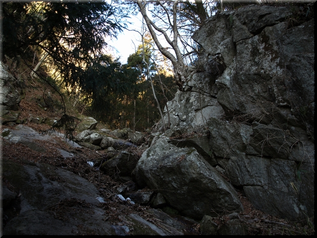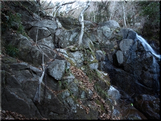冬の産物に気を付けて沢を歩き、鎖を頼りに岩場をよじ登る。