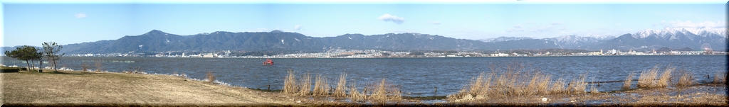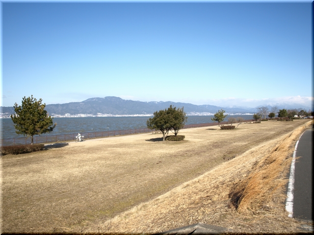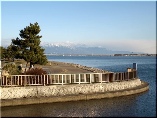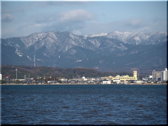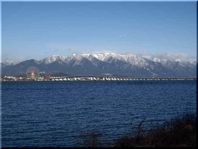 ・ 琵琶湖大橋東岸から雪化粧をした比良山地を眺める