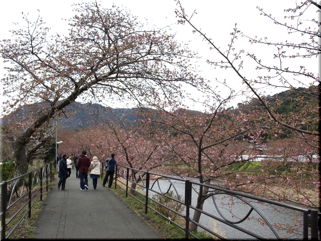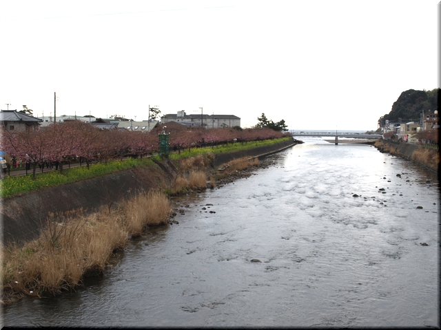 ・ 河津川沿いに並び咲く河津桜を見渡す