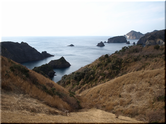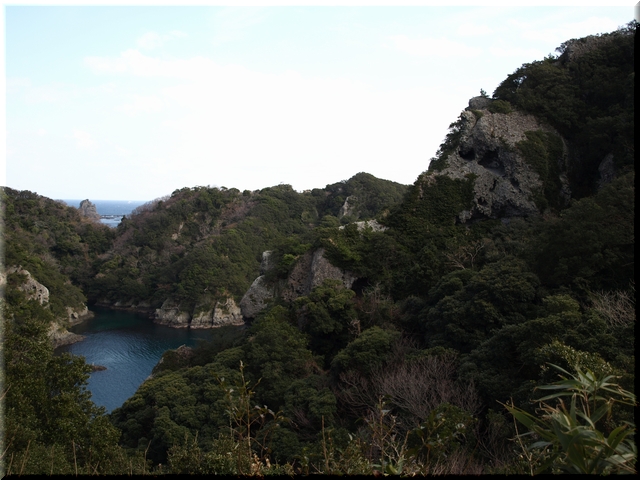 ・ 遊歩道から駿河湾に浮かぶ三ツ石岬を眺める