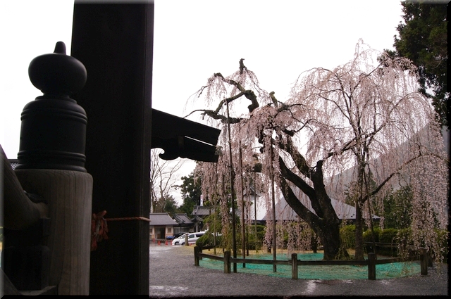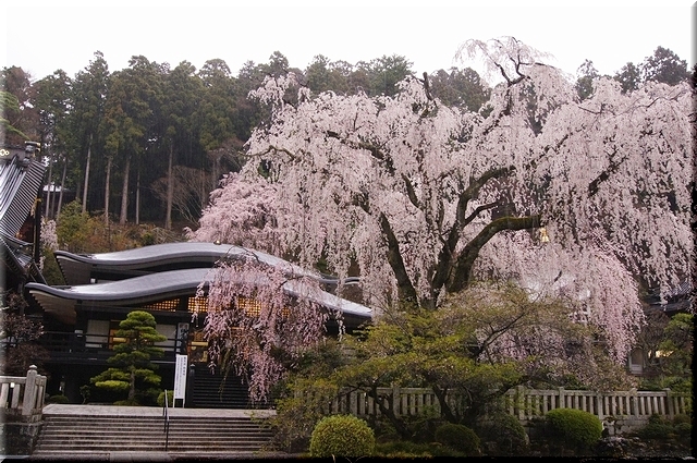 ・ 祖師堂の近くで花開く枝垂桜を見上げる