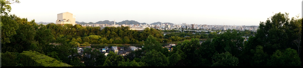・ 素屋根の中で改修作業が進む姫路城を遠望する