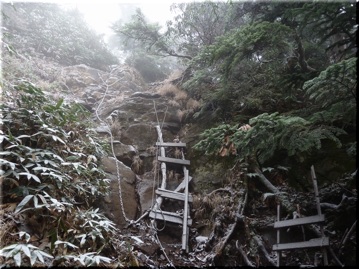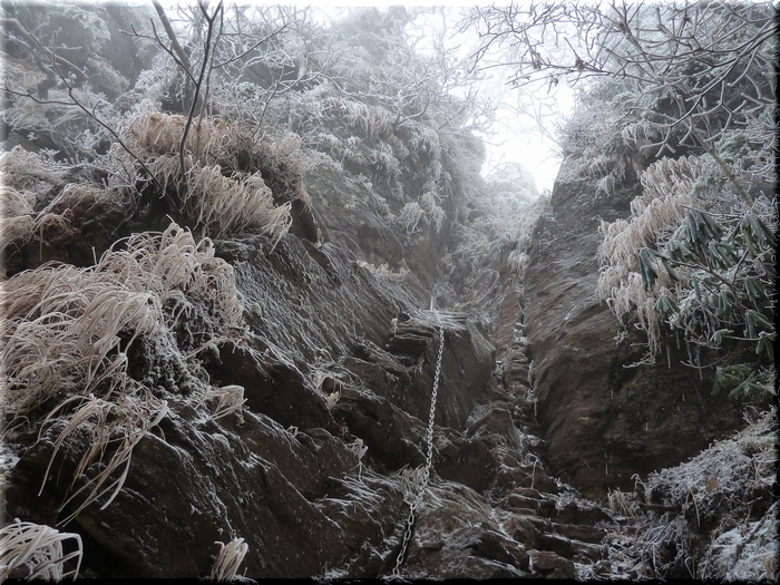 ・ 山頂手前で連続する最後の鎖場前で気合いを入れる