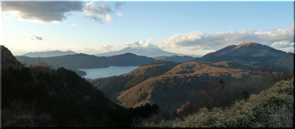 ・ 日没前の淡い日差しに照る芦ノ湖と富士山を眺める
