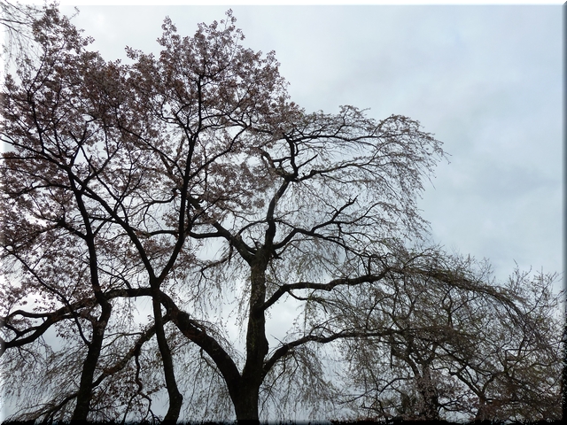 ・ どんよりした曇り空の下で散り際の山桜を見やる