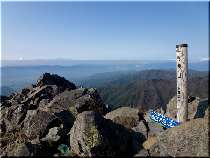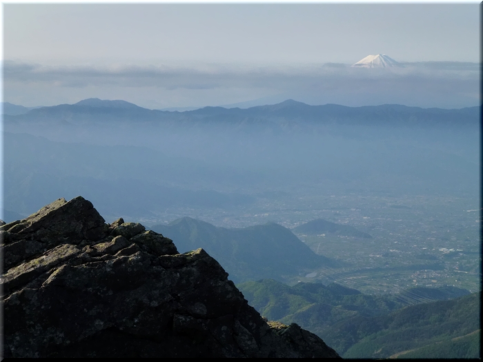 左のピークが乾徳山、富士山今度は頭を隠し中。