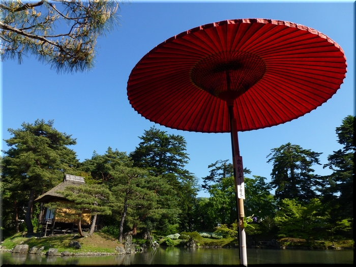 突き抜けるような青空に赤傘が一層映える。