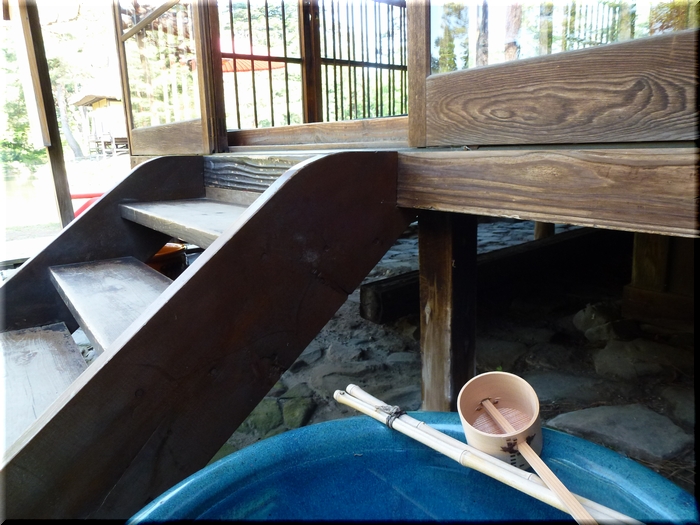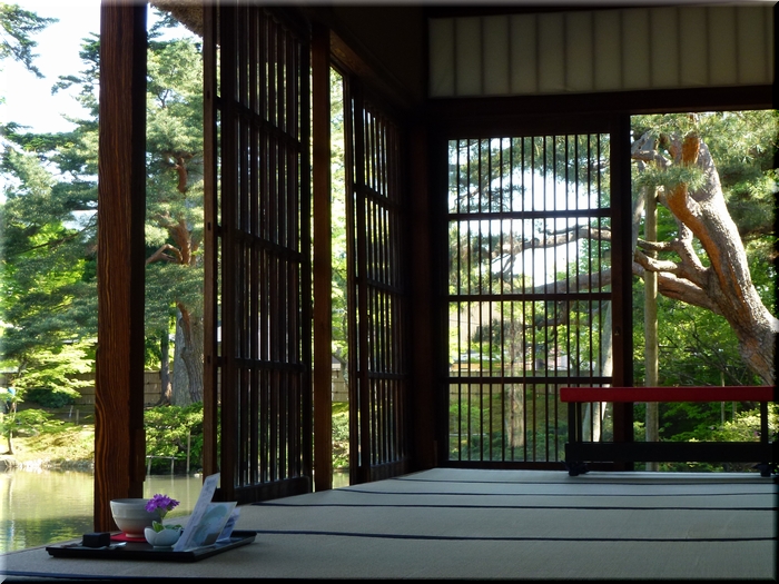 ・ 降り注ぐ日差しの下で心字の池越しに楽寿亭を眺める