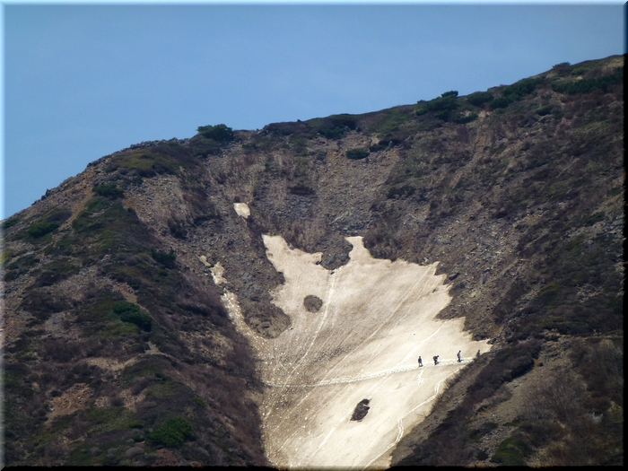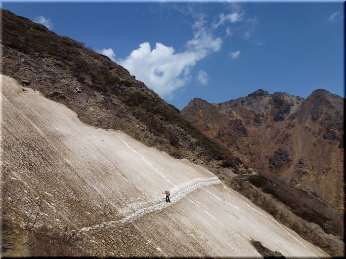 集中力のあるうちに雪渓横断をと、