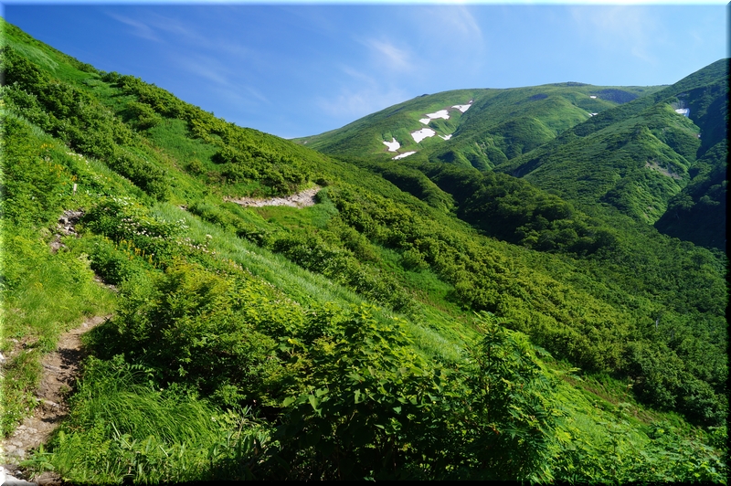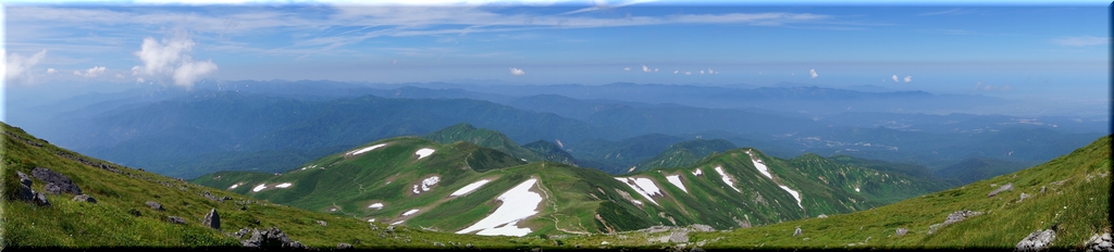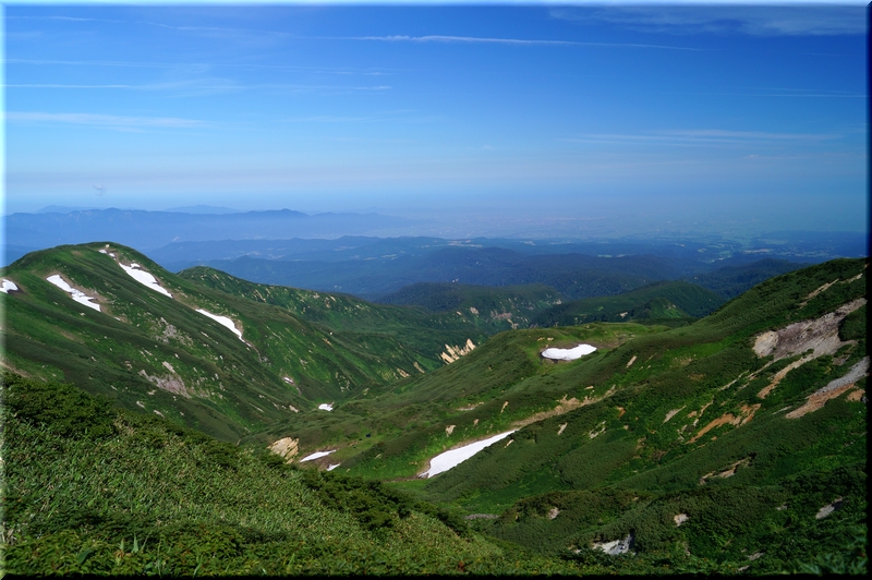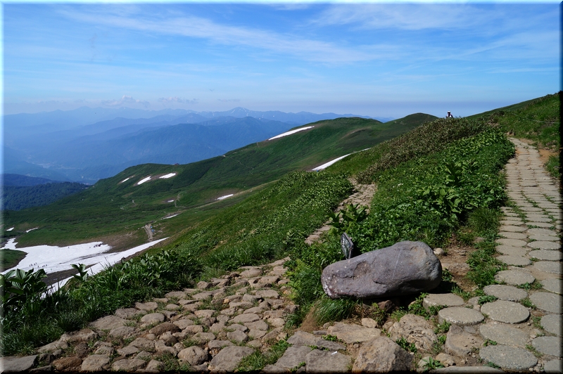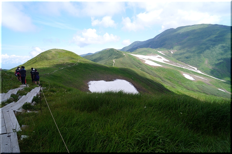 ・ 盛夏に映える残雪と遠くに聳える朝日岳を眺める