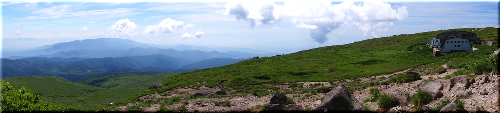 その頂からの東方の眺め。建物は上記の「月山頂上小屋」。