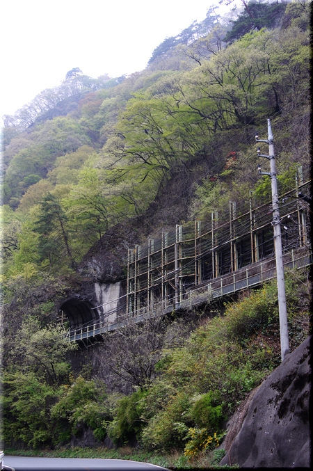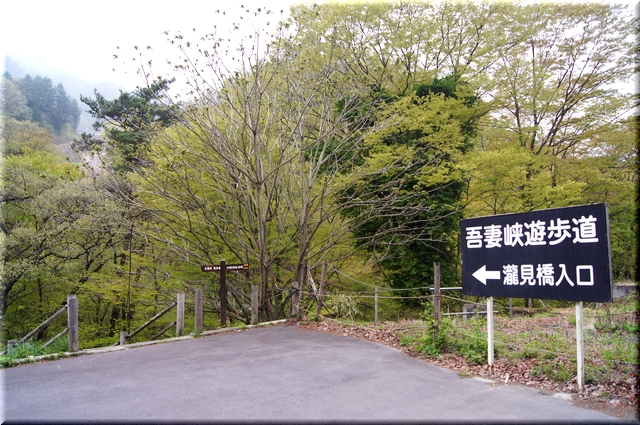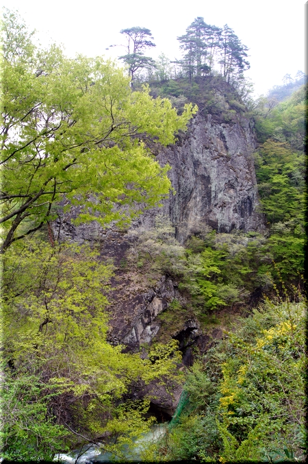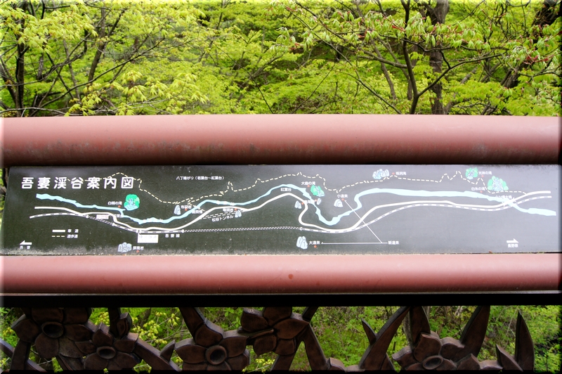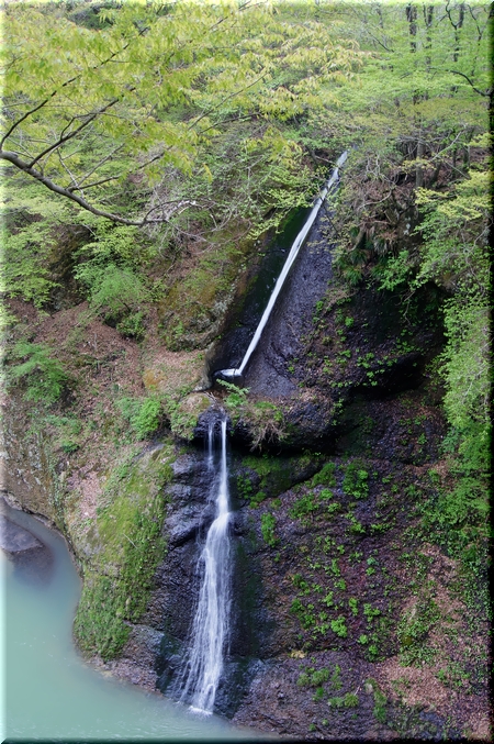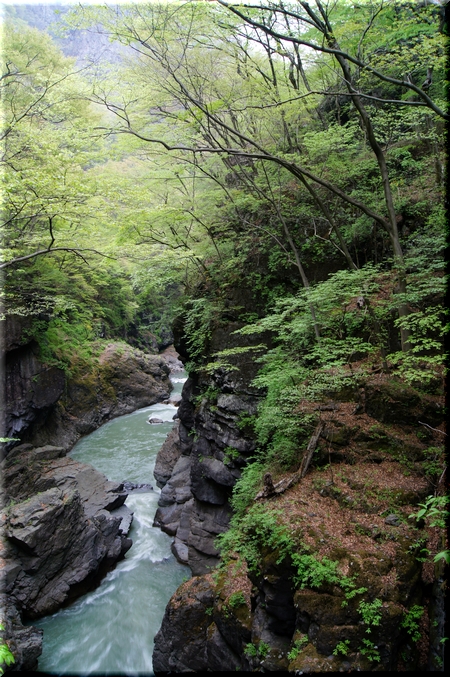 ・ 新緑の映える八丁暗がりに架かる鹿飛橋を眺める
