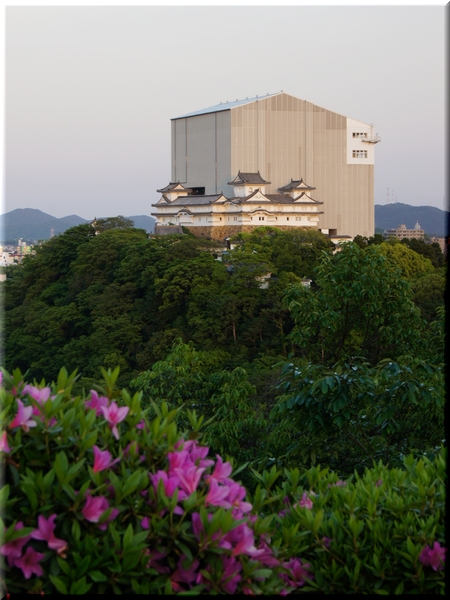 ・ 素屋根の中で改修作業が進む姫路城を遠望する