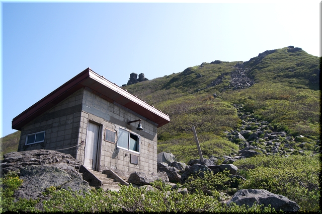 ・ 右 : 鳳鳴ヒュッテ(非難小屋) … ここから山頂まで岩場に。