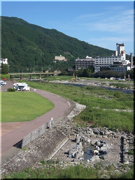 ・ 飛騨川に架かるいで湯大橋から噴泉池を眺める