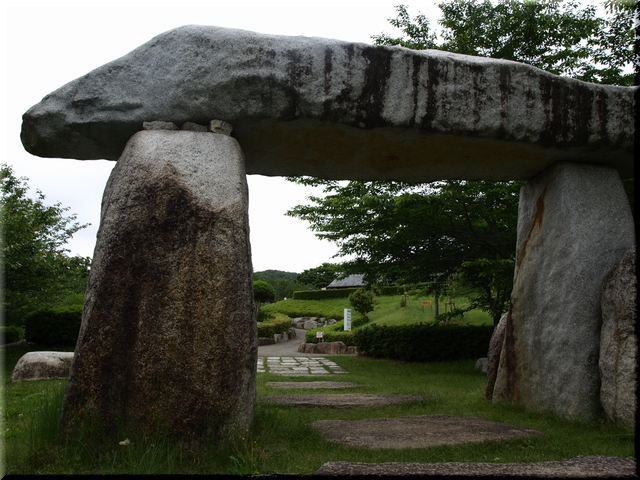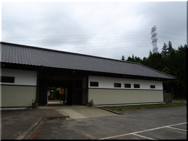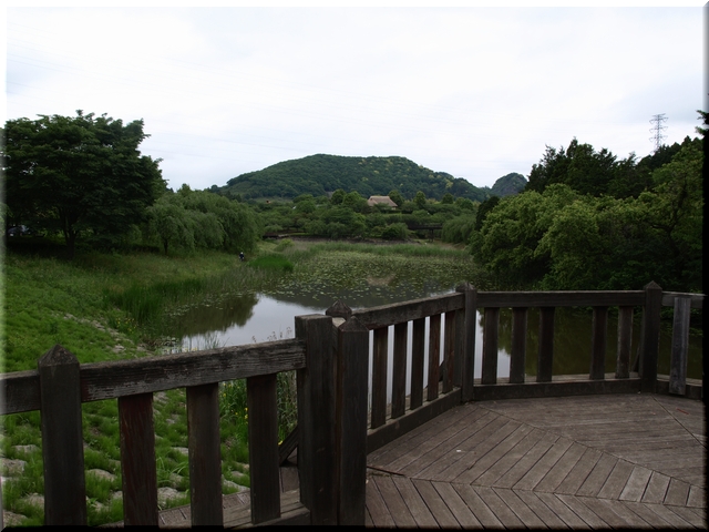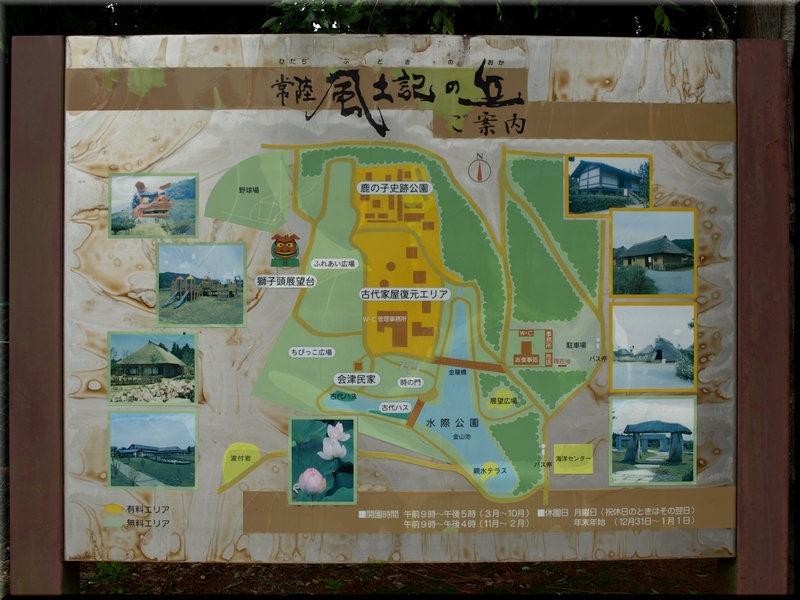 ・ ふれあい広場で古代家屋を見守る獅子頭
