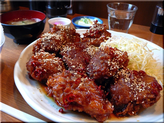 肉汁あふれる唐揚げに唐辛子の入った甘辛ダレが絡む。