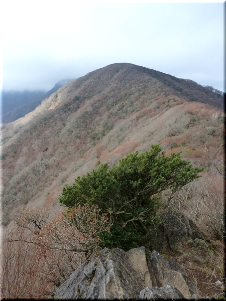 ・ 馬の背から雲に隠れた石楠立と万三郎岳を眺める