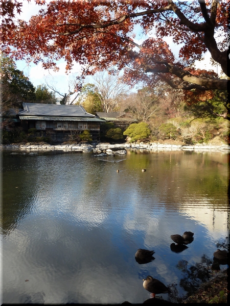 ・ 姿勢の良い鴨と小浜池越しに楽寿館を見つめる