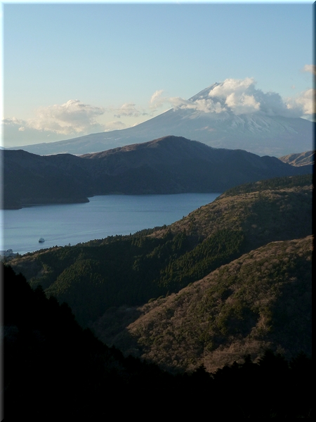 ・ 日没前の淡い日差しに照る芦ノ湖と富士山を眺める