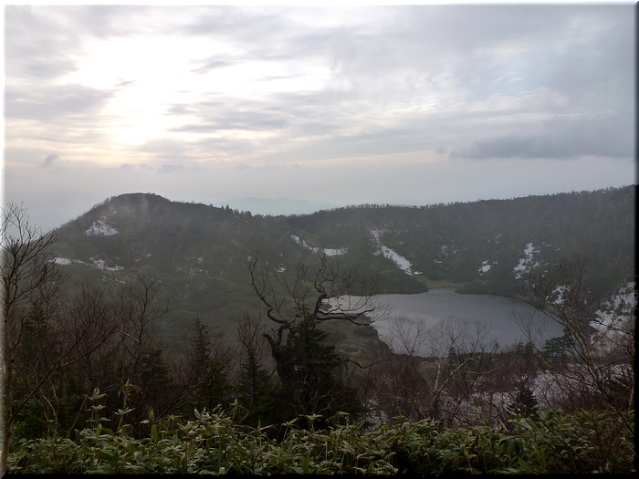 火口湖「鏡池」を見届けてゲレンデの分岐へと下山。